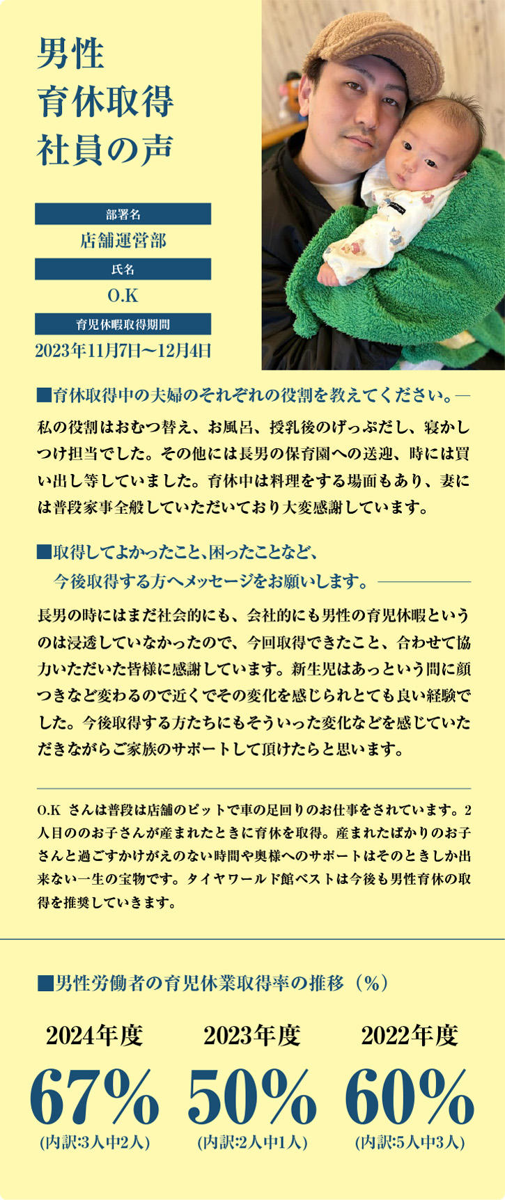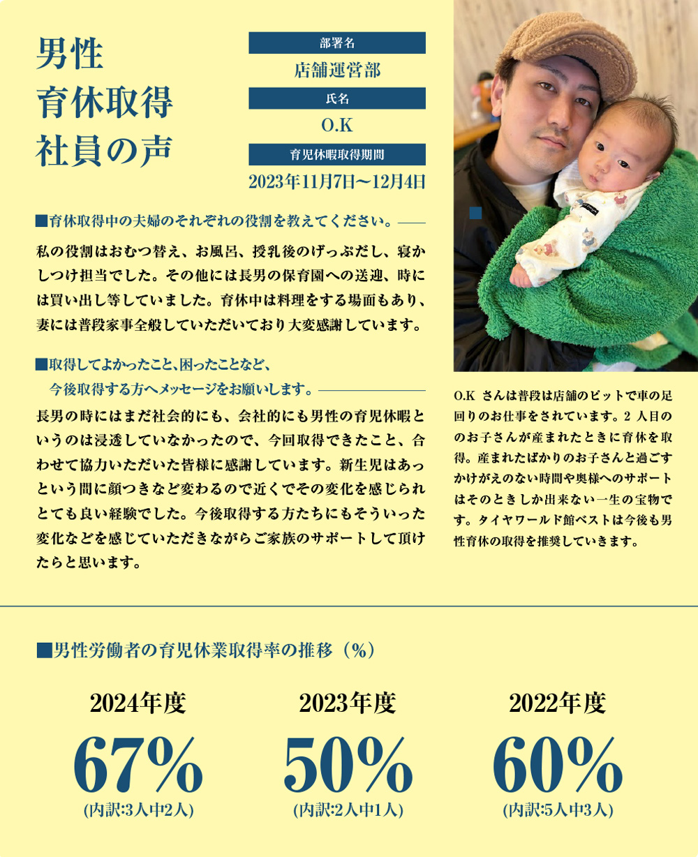 - ②男性育児休業取得促進 初めて利用する男性社員に向けて事前説明会を実施。今後も取得率向上を目指していきます。