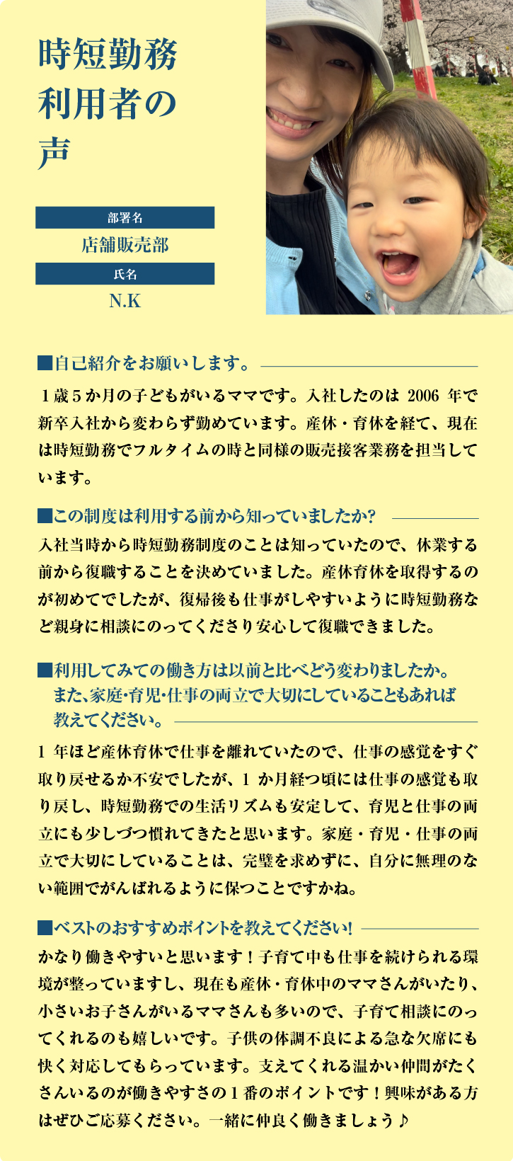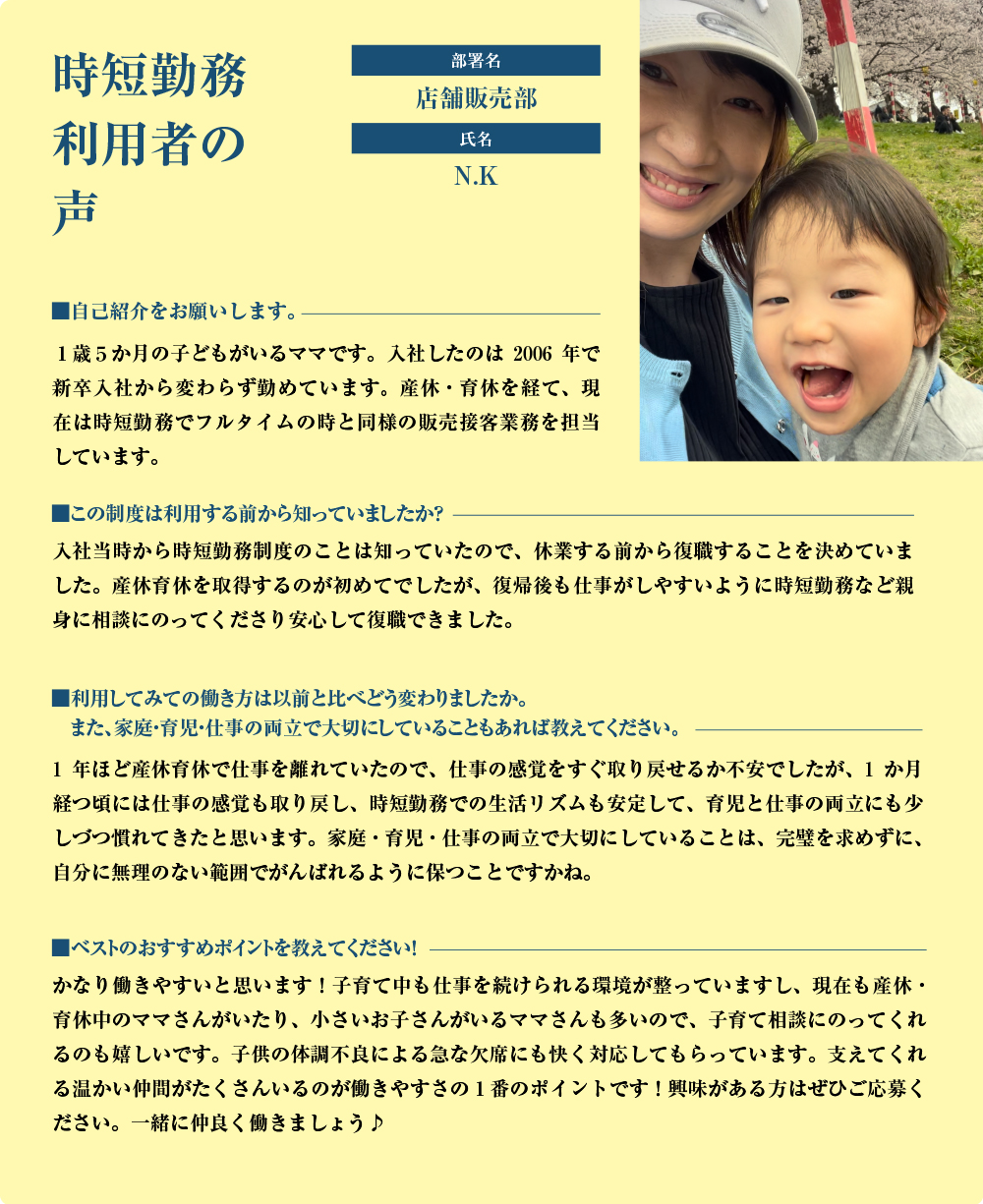 - ①短時間勤務制度 小学生6年生までのお子さんがいる社員が利用することができる制度。最短6時間から30分刻みで勤務時間を選択できます。
