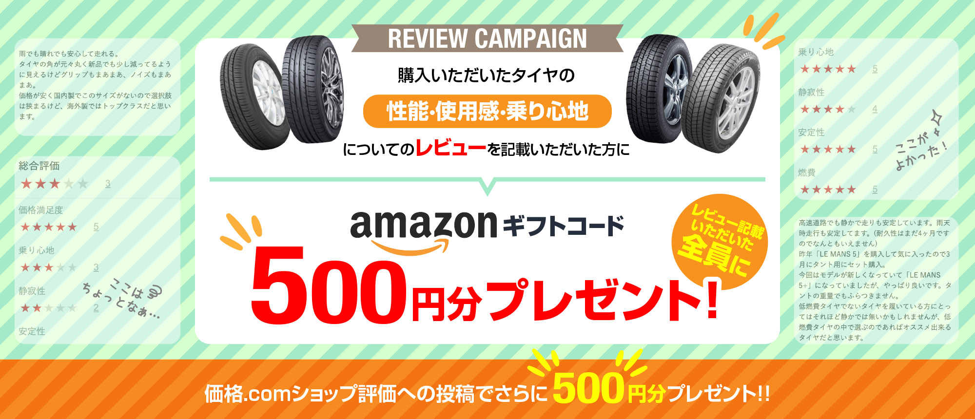 ※毎月1日~末日までに【タイヤの性能について】のレビュー記載いただいた方へ、翌月20日(※土日の場合は翌週月曜)までに会員情報のご登録メールアドレス宛に500円分のamazonギフトコードをお送りさせていただきます。